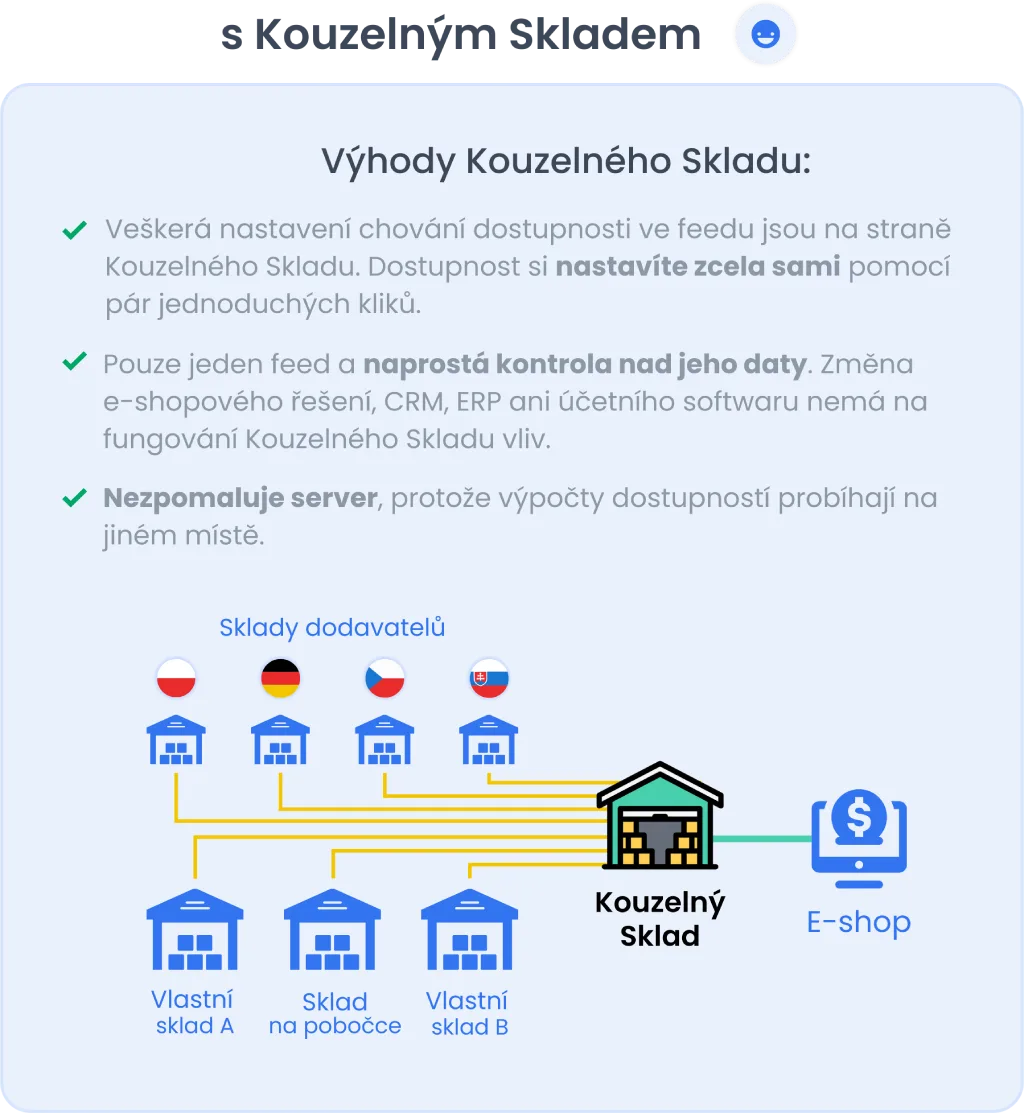 Každý feed reprezentuje jeden sklad, který může mít libovolně komplexní pravidla zpracování. Kromě toho můžete definovat kusovníky.